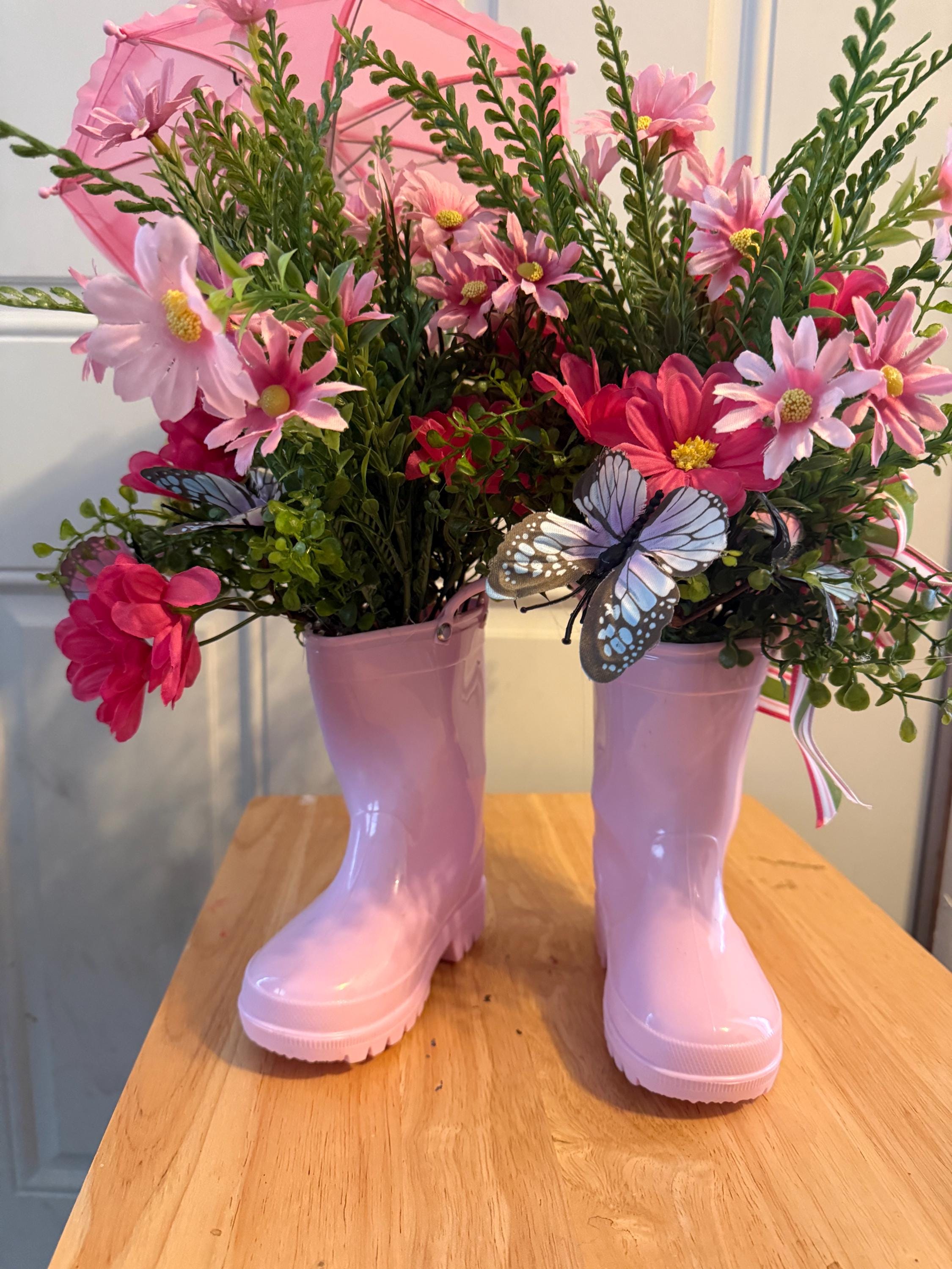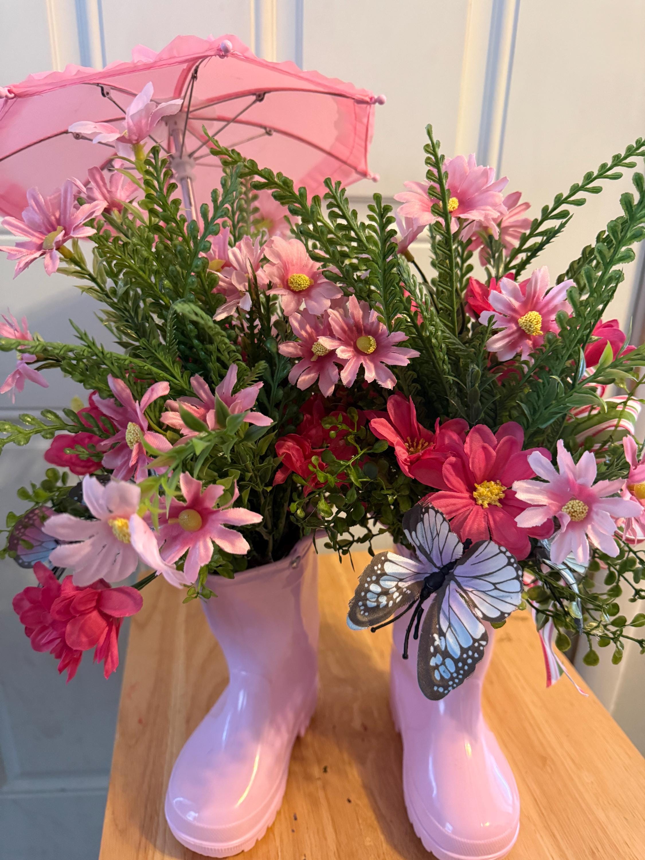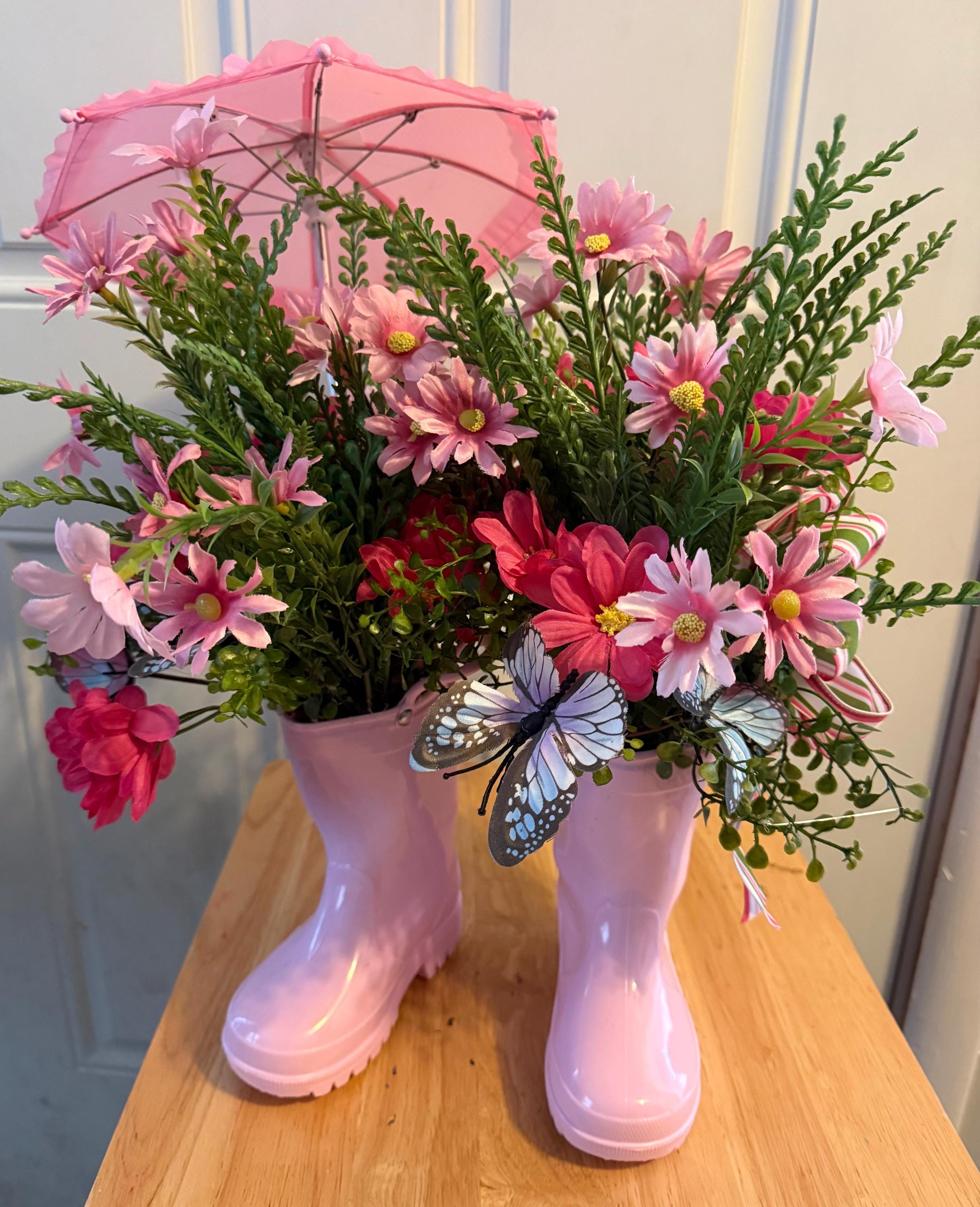 Bring a cheerful touch of spring into your home with this adorable pink rain boot floral centerpiece! 🌸