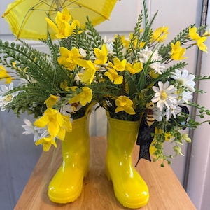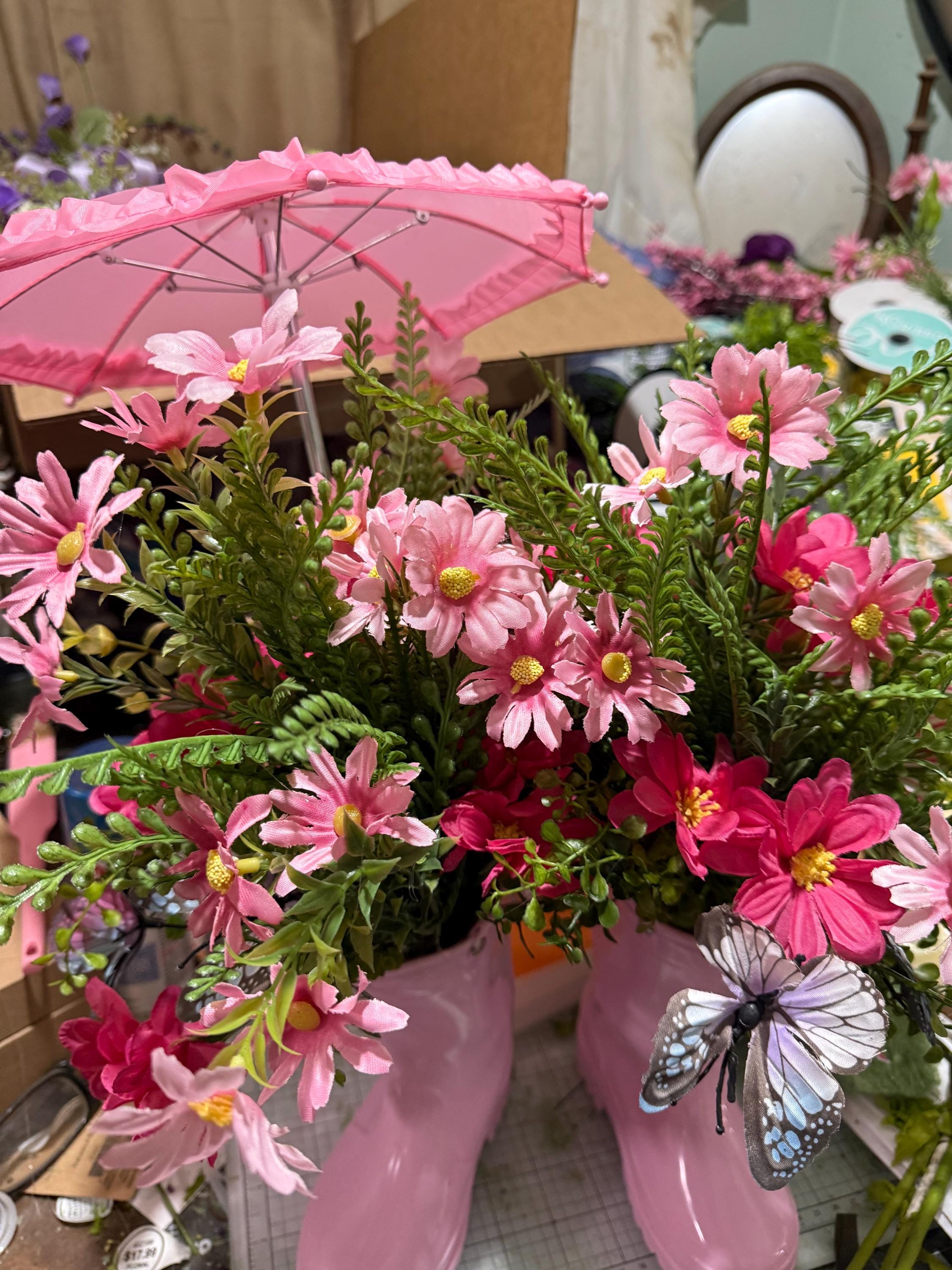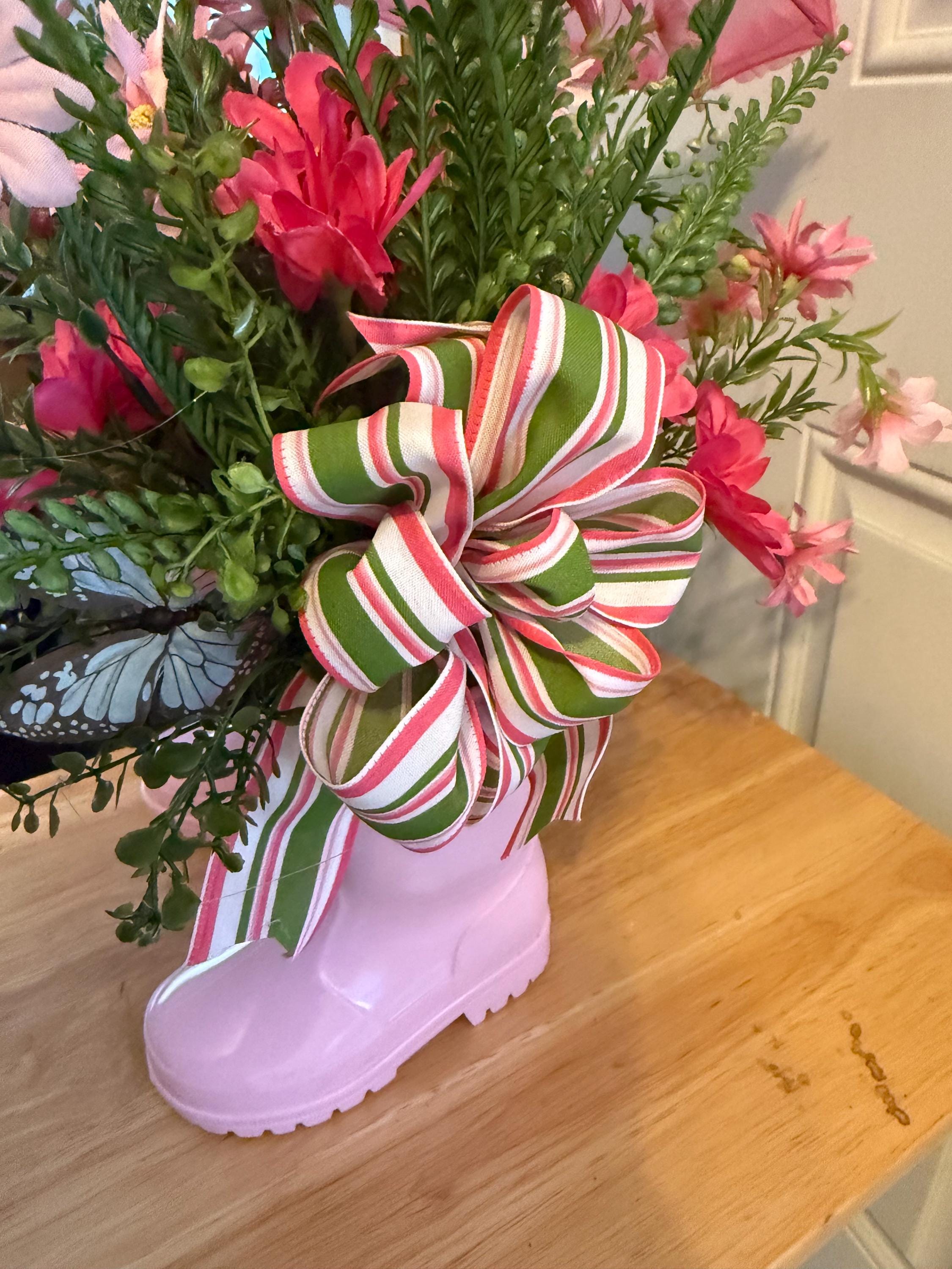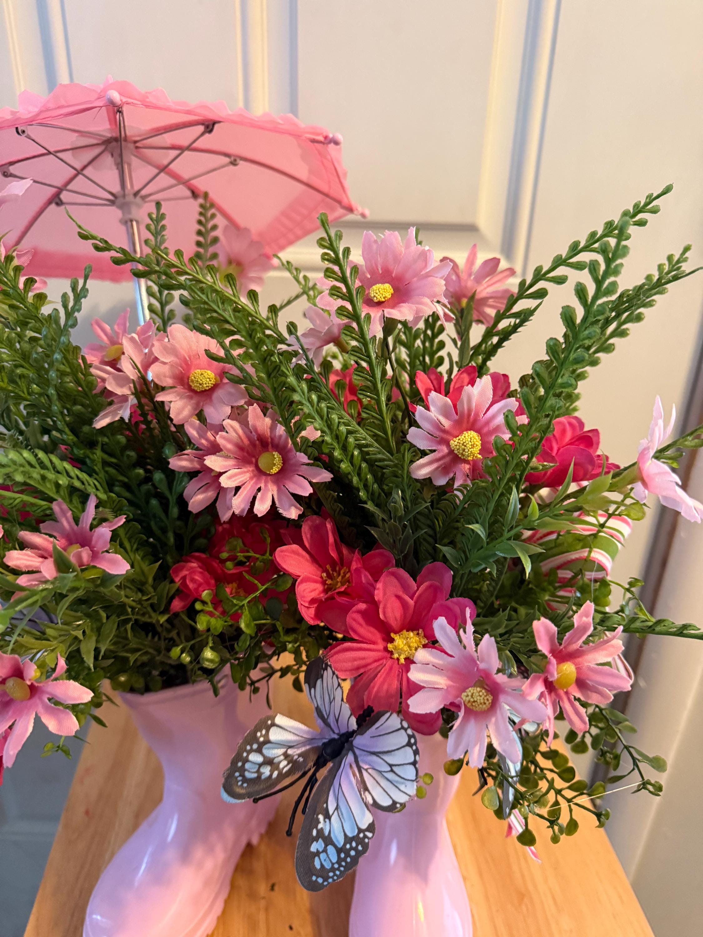 Bring a cheerful touch of spring into your home with this adorable pink rain boot floral centerpiece! 🌸