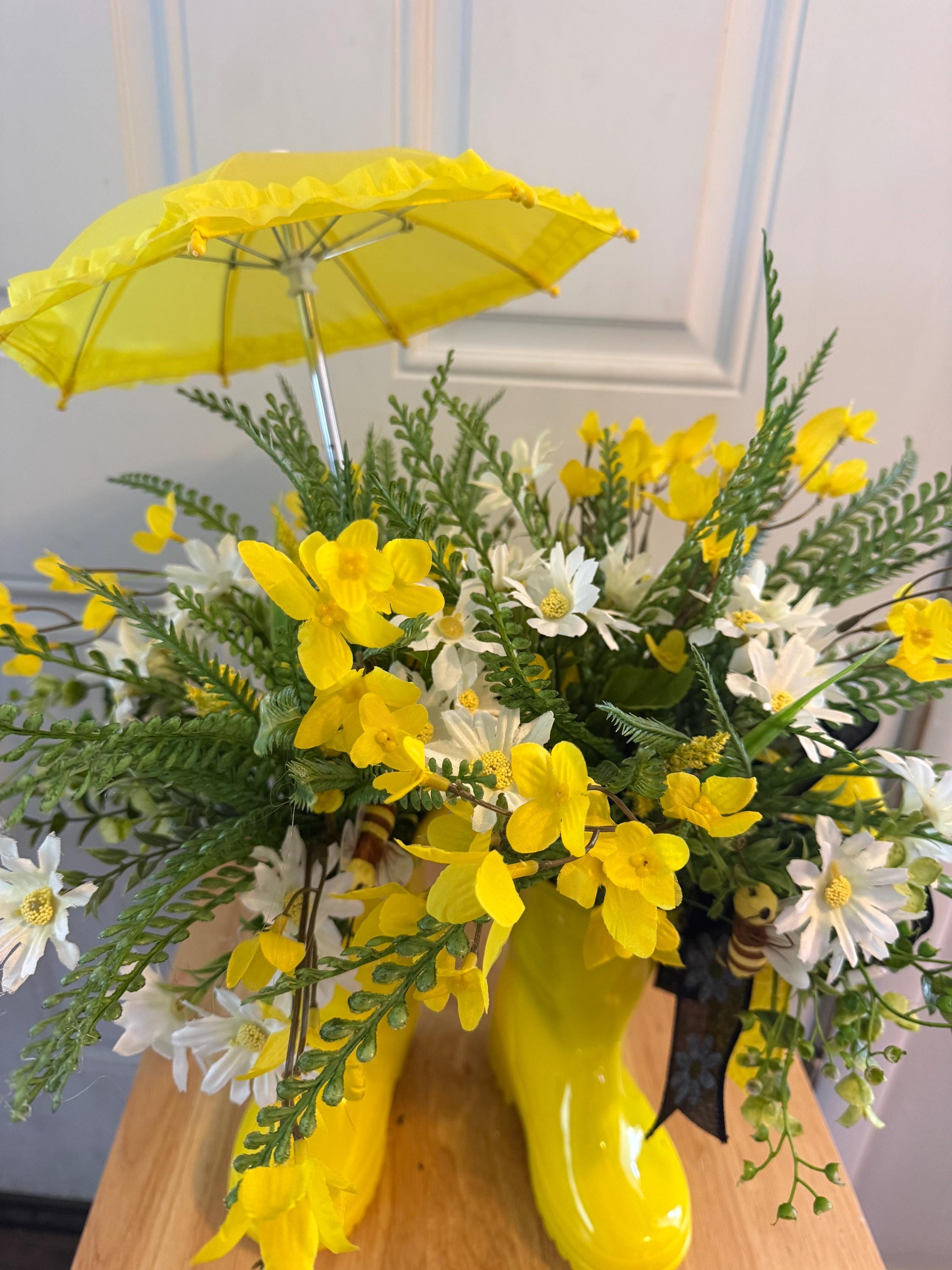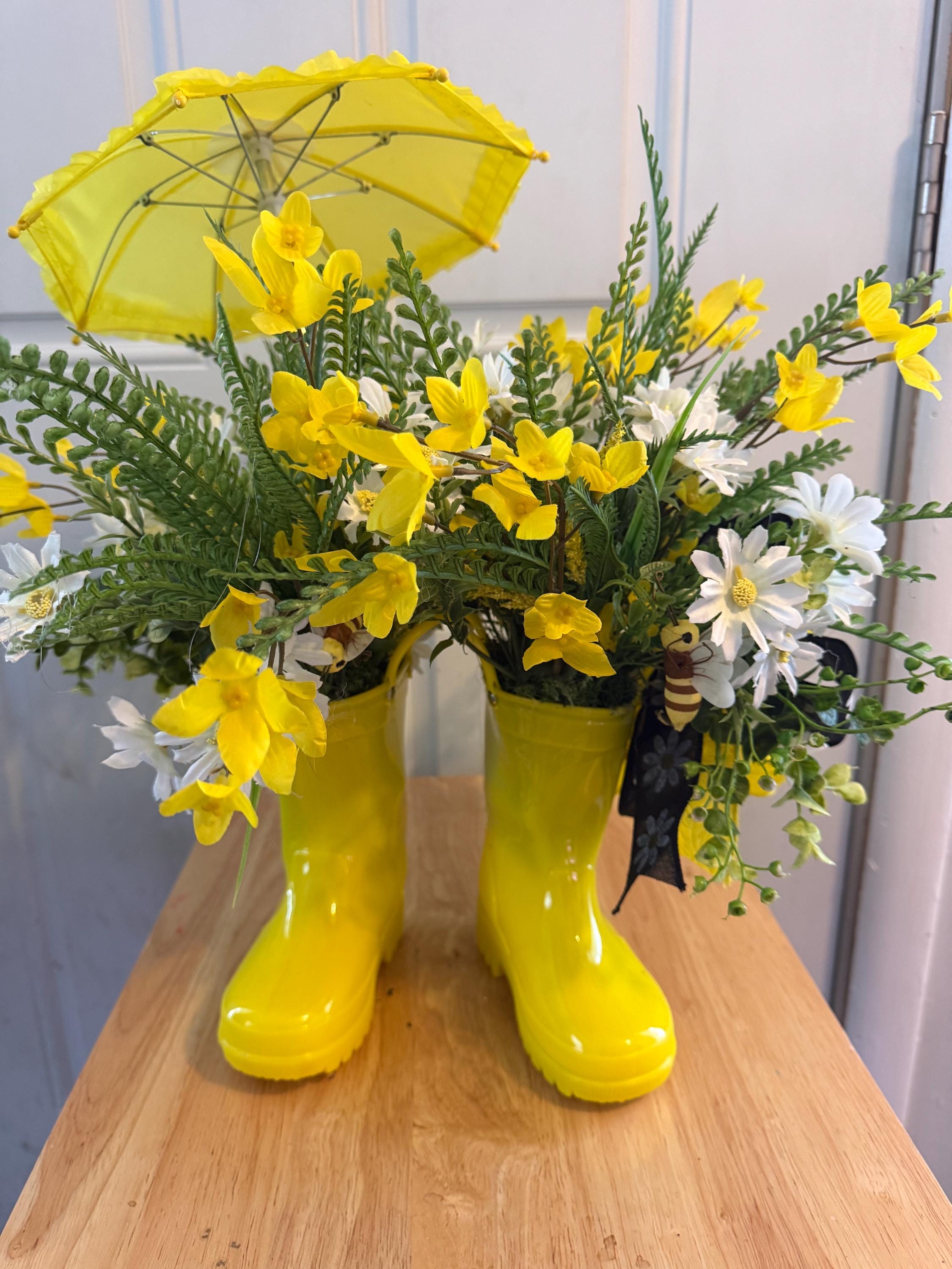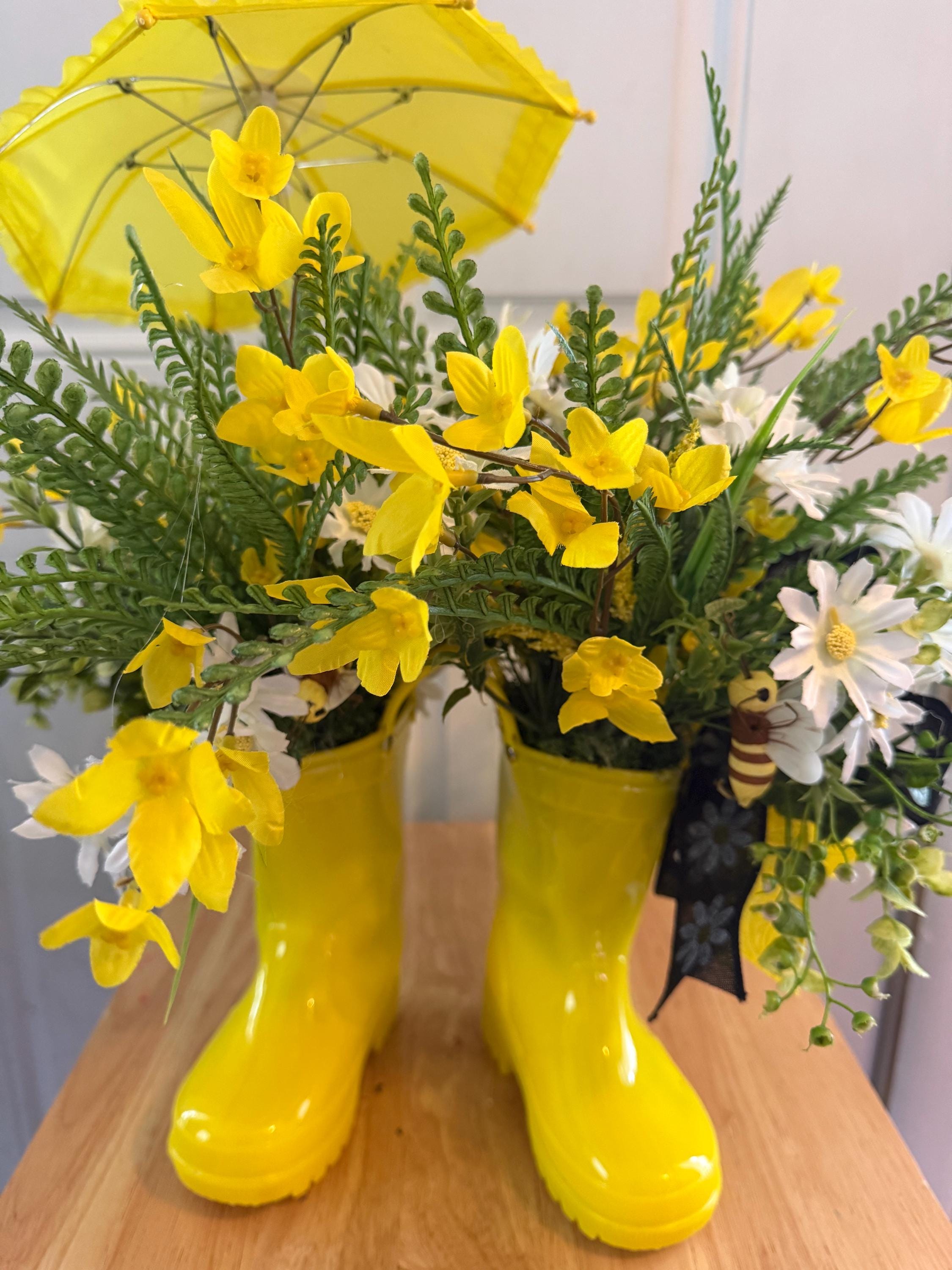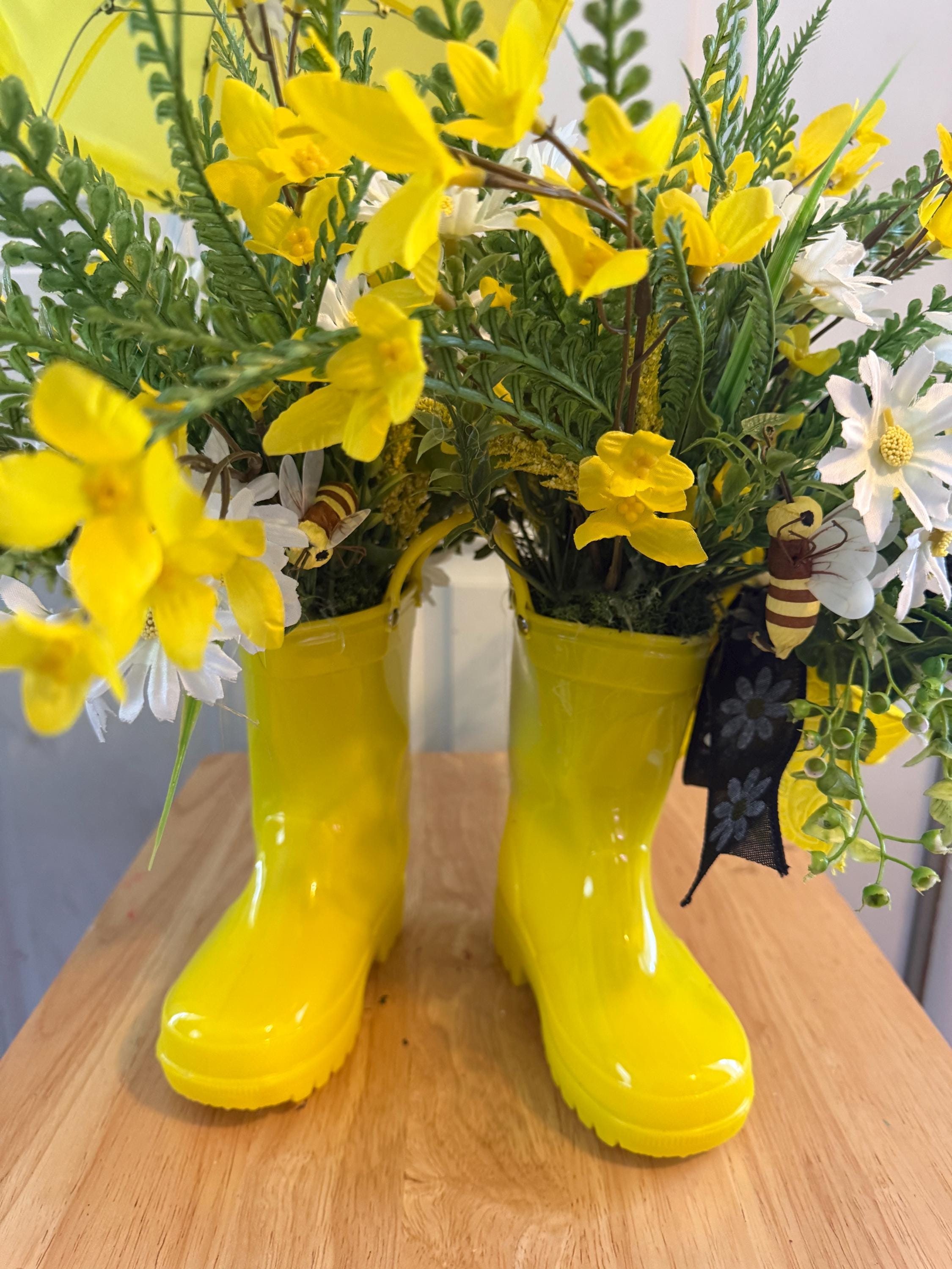 Bring a cheerful touch of spring into your home with this adorable yellow rain boot floral centerpiece! 🌸